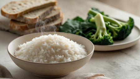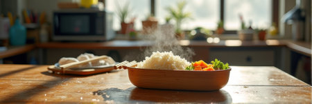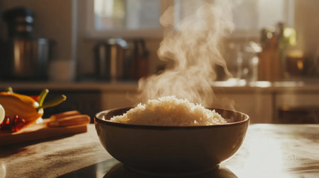 Steaming rice bowl with vegetables in sunlit kitchen. That the image is generated using AI.