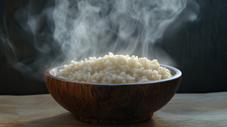 A steaming bowl of rice showcases its fluffy texture and aromatic qualities, perfect for enhancing meals. The wooden bowl adds a rustic touch.