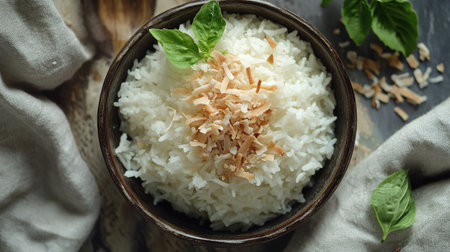 Top view of a serving of Thai coconut rice with shredded coconut garnish