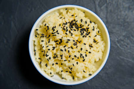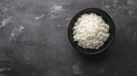Boiled rice in a brown plate on black concrete background. Asian food. Top view with copy space.