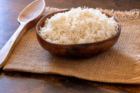 Porcelain pan with raw white rice and wooden spoon on black background. White rice. Human food. Cereals rich in starch and source of nutrients. Culinary delicacy.
