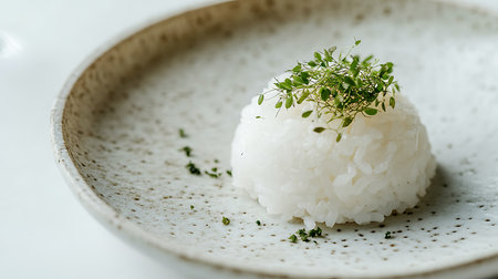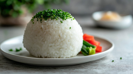 A Japanese rice ball with a simple yet elegant presentation, resting on a clean white plate with a garnish of vegetables and a soft light background