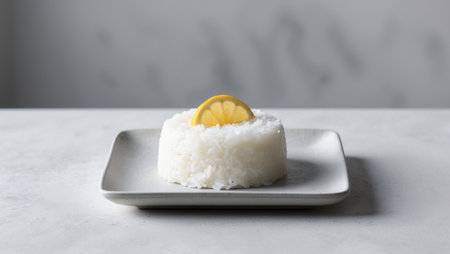 AI Generated. A simple plate of cooked rice served with a slice of lemon