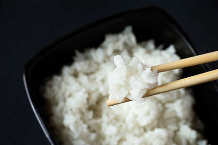 Bowl with boiled white rice on a black background. Asian food and bamboo chopsticks.