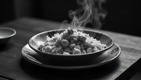 Delicious Hot Rice Dish in Bowl on Smoky Blurry Background Image