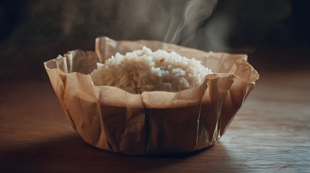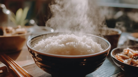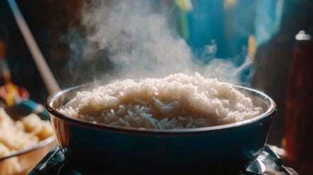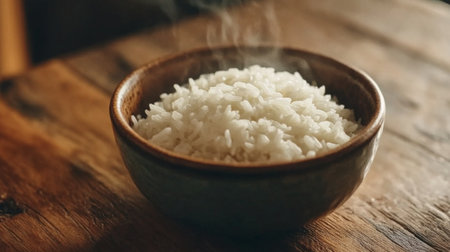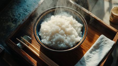 A steaming bowl of rice exudes warmth and comfort, perfect for any meal setting. Ideal for showcasing culinary delight in a dining atmosphere.