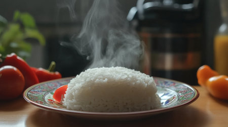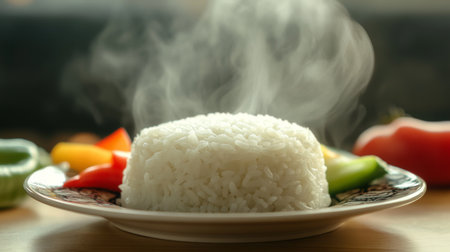 A warm shot of a single serving of steaming white rice on a decorative plate, with colorful vegetables around it, showcasing an inviting culinary display