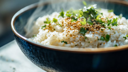 A close-up of a steaming bowl of rice with a sprinkle of sesame seeds and a few fresh herbs, highlighting the delicious and appetizing presentation of the dish.