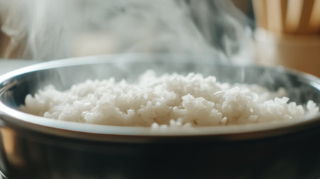 A close-up shot of a steaming bowl of freshly cooked white rice, with condensation on the bowl, highlighting its fluffy texture and inviting aroma