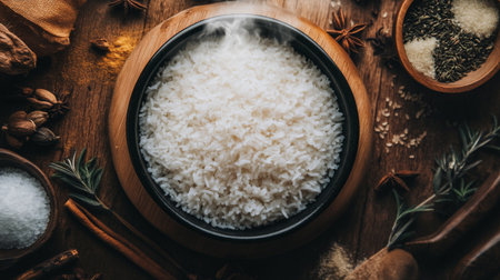 A steaming bowl of white rice surrounded by various spices and herbs on a rustic wooden table, creating an inviting atmosphere for culinary delights.