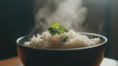 A close-up shot of a bowl of hot steamed rice, garnished with a small sprig of cilantro, with steam rising against a dark background for a dramatic and appetizing look.
