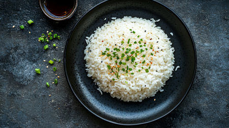 A beautiful serving of freshly cooked white rice garnished with chopped chives, served with soy sauce. Perfect for illustrating Asian cuisine or healthy meals.