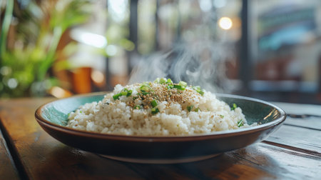 A steaming bowl of fluffy rice, delicately garnished with chopped green onion and sesame, sits on a rustic wooden table, inviting warmth and comfort.