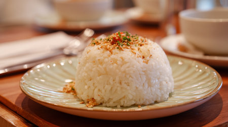 A close-up of delicious steamed white rice garnished with spices, served on a light green plate in a warm restaurant setting, ideal for culinary enthusiasts.