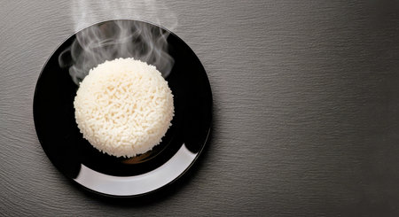 A close-up of steaming white rice in a black bowl against a dark background, evoking a sense of warmth and comfort in dining and culinary scenes.