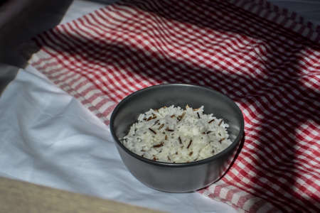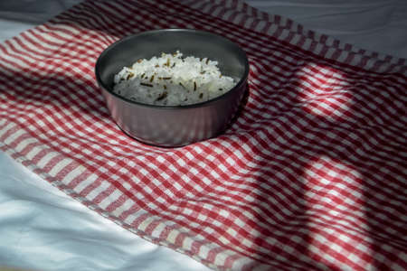 white parboiled black rice in dark cup on plate on red-white cloth towels under the light of the sun with shadow on the table