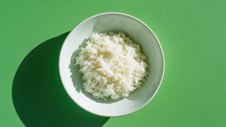 A fresh bowl of cooked white rice beautifully presented on a vibrant green background. This image captures simplicity and culinary appeal.