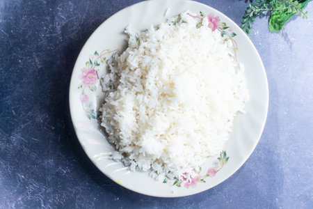 Plain Steamed Rice served in plate isolated on grey background top view of bangladeshi food