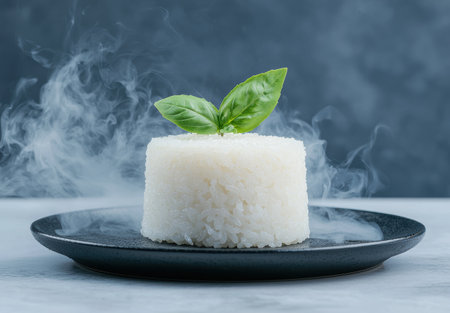 An artistic shot of white rice presented in a polished bowl, with steam gently rising and colorful ingredients surrounding it for a vibrant culinary scene.