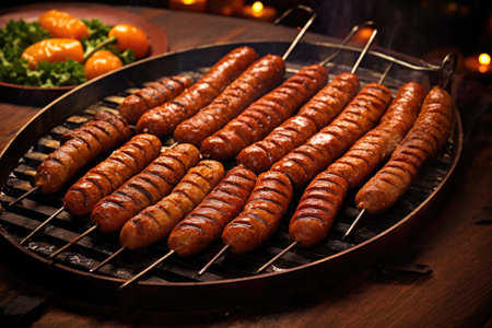 Shallow depth of field (selective focus) image with Romanian traditional mici (mititei), grilled ground meat rolls in cylindrical shape on the barbecue grill.