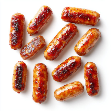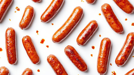 Pattern of crispy fried red sausages, delicious and appetizing on white