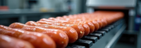 Fresh sausages are coming out of industrial oven in modern food processing plant