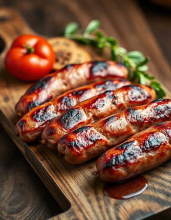 Grilled sausages rest on a wooden board alongside a tomato and herbs