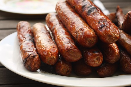 pork and beef sausages made on an electric grill