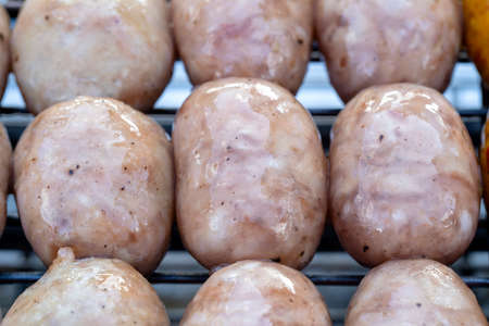 Grilled Thai sausage at street food market in Thailand, close up. Traditional Thai sausage with pork and rice, delicious street food.