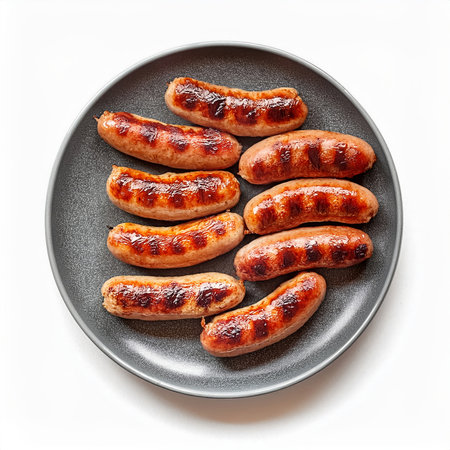 A close up overhead shot of ten grilled sausages arranged on a grey plate Perfect for BBQ or summer cookout imagery