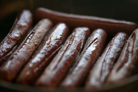 Close-up view of fried sausages. Meat fish. Cooking food. High quality photo