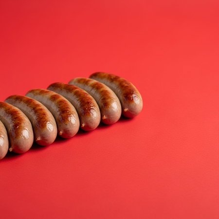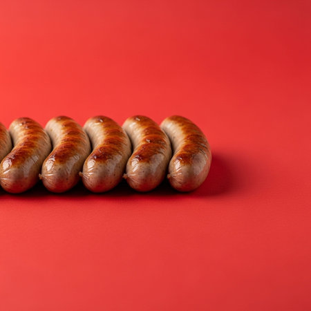 Grilled sausages on a red background. Copy space.