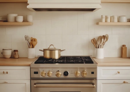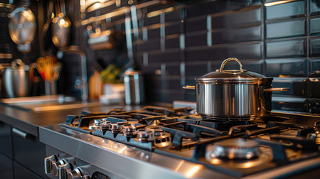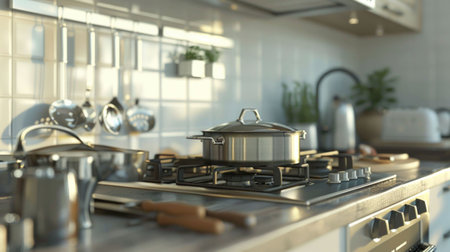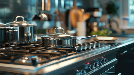 Modern kitchen interior with stainless steel pots and pans on a stove top, cooking utensils in a contemporary cooking space