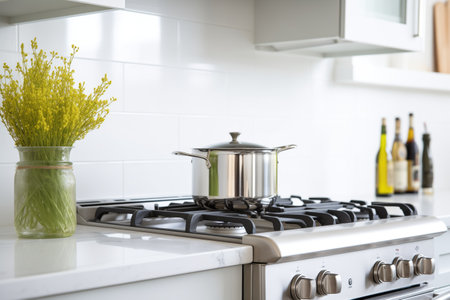Gas cooking stove of modern home white kitchen room with design interior - cooktop, plants and cuisine elegant accessories. Stylish neutral domestic decor. Designer style concept. Copy ad text space