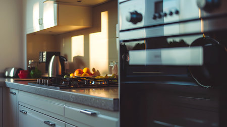 A contemporary kitchen scene featuring a shiny stainless steel cooker and kettle, illuminated by natural light, with soft focus on inviting decorative touches in ac