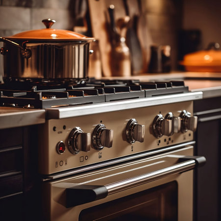 modern gas stove in a bright kitchen with stainless steel pots