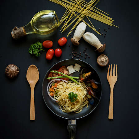 Delicious Italian spaghetti Mussel, Fresh Spaghetti pasta with seafood, Italian style pasta dinner. Spaghetti with tomato and basil in plate on wooden board and ingredients for cooking pasta over dark plywood background