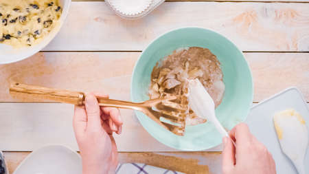 Mixing ingredients together in mixing bowl for blueberry muffins.