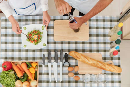 Hands of wife mixing salad while her husband opening beer bottle, view from above