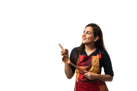 Indian / asian woman chef wearing Apron and holding wooden spatula while standing isolated over white background