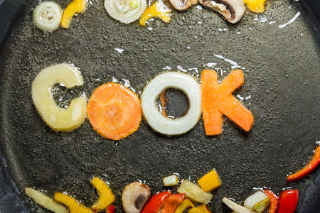 fried vegetables in the form of letters on a frying pan in oil