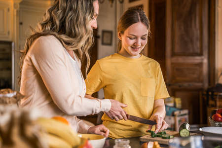 Woman trying to help her teenage daughter chopping vegetables for salad