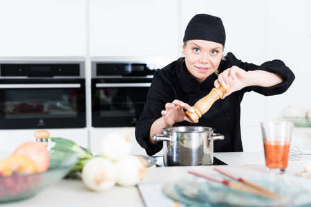 Woman professional is cooking soup in the kitchen