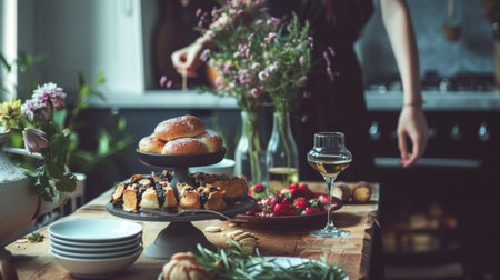 A cozy breakfast table setup with pastries, flowers, and a glass of beverage in a homely atmosphere.