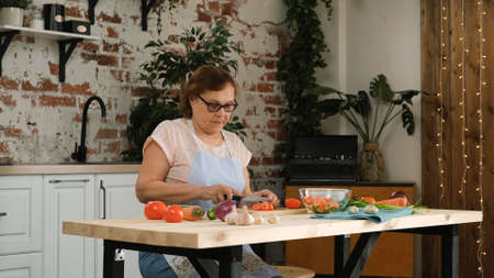 Senior Woman in Apron and Glasses Cutting Vegetables on Wooden Board, Cooking Healthy Vegan Dinner