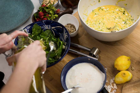 blogger guy taking pictures of salad in the kitchen. cooking healthy food .