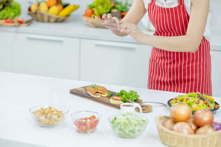 Hands of woman with red apron use mobile phone take photo of plate of slicing fish in kitchen with different type of ingredients and garnish on table. Concept of happiness of cooking in their house.