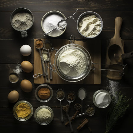 Baking ingredients and kitchen utensils on dark wooden background.