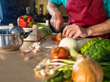 Man in red apron cutting tomatoes and surrounded by fresh vegetables. Life at home. Cooking for the family. Warm colors.