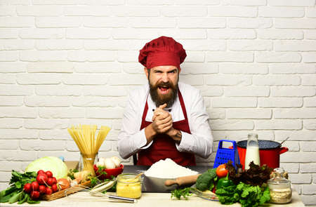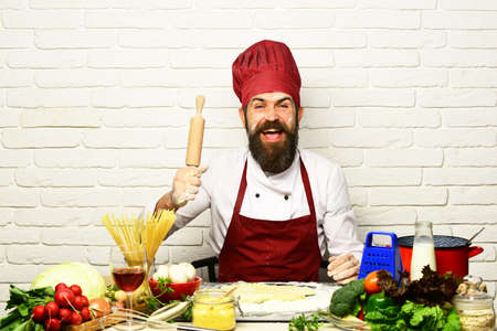 Professional cookery concept. Man with beard holds rolling pin